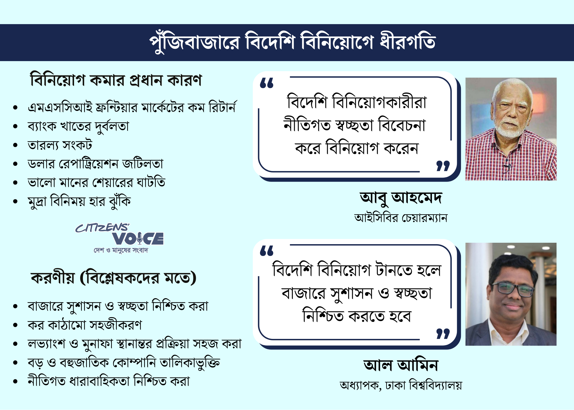ব্রোকারেজ হাউসের কর্মকর্তারা বলছেন, বিদেশি বিনিয়োগকারীরা দীর্ঘমেয়াদি স্থিতিশীলতা ও নীতিগত ধারাবাহিকতা খোঁজেন। বৈশ্বিক অর্থনৈতিক অনিশ্চয়তা এবং দেশীয় চ্যালেঞ্জ মিলিয়ে তারা সতর্ক। অর্থনীতিবিদদের মতে, পুঁজিবাজারে বিনিয়োগ বাড়াতে কর কাঠামো সহজ করা, লভ্যাংশ ও মুনাফা স্থানান্তর স্বচ্ছ করা এবং সুশাসন জোরদার করা জরুরি।