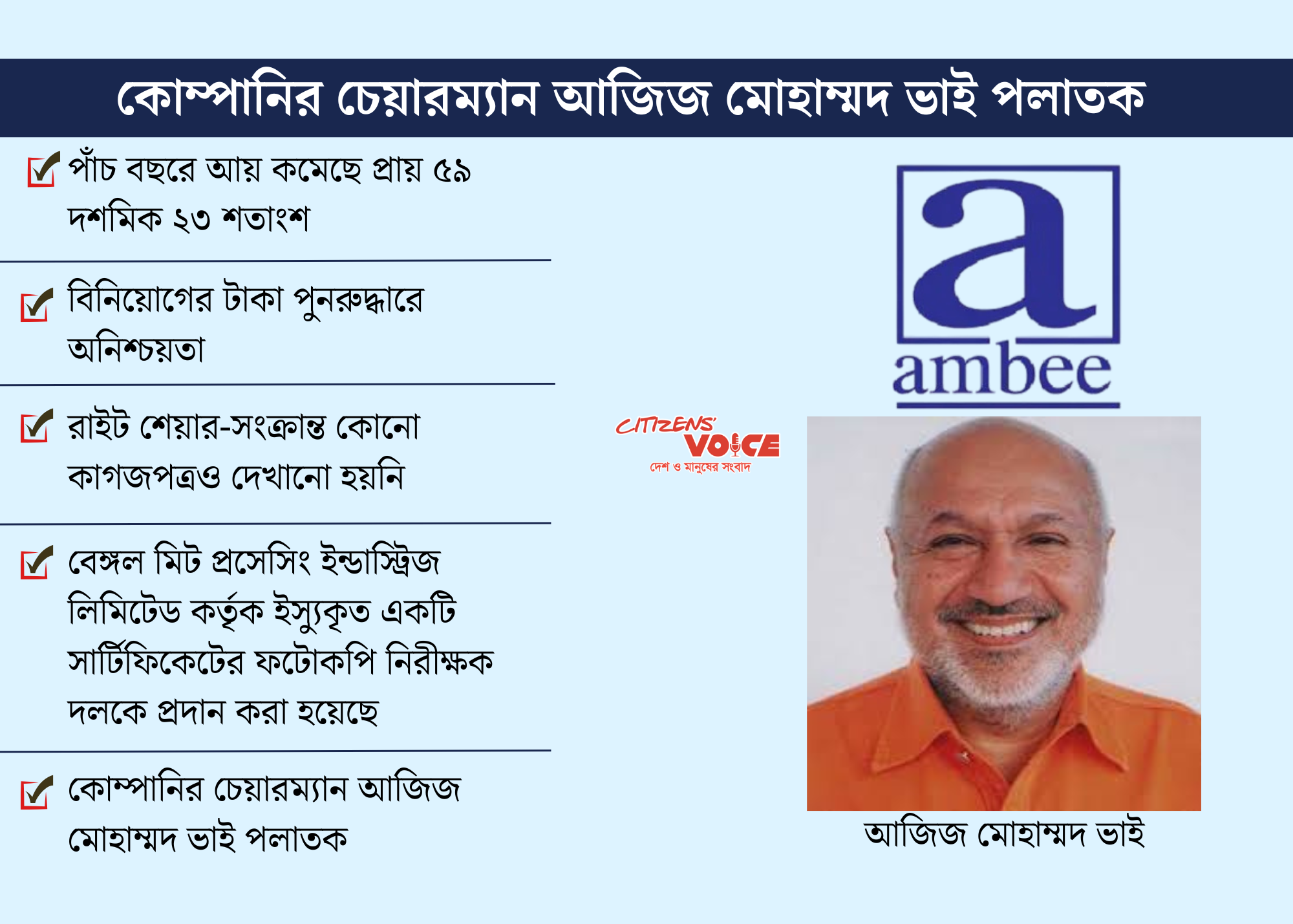 কোম্পানির চেয়ারম্যান আজিজ মোহাম্মদ ভাই অতীতে চলচ্চিত্র জগতের আলোচিত ব্যক্তিত্ব ছিলেন। তিনি বর্তমানে সোহেল চৌধুরী হত্যা মামলার যাবজ্জীবন সাজাপ্রাপ্ত এবং দেশের বাইরে পলাতক। সম্প্রতি তিনি ঢাকা স্টক এক্সচেঞ্জের ব্লক মার্কেটের মাধ্যমে আলাদা কোম্পানির শেয়ার ক্রয় করেছেন, যা বিনিয়োগকারীদের মধ্যে মিশ্র প্রতিক্রিয়া সৃষ্টি করেছে।